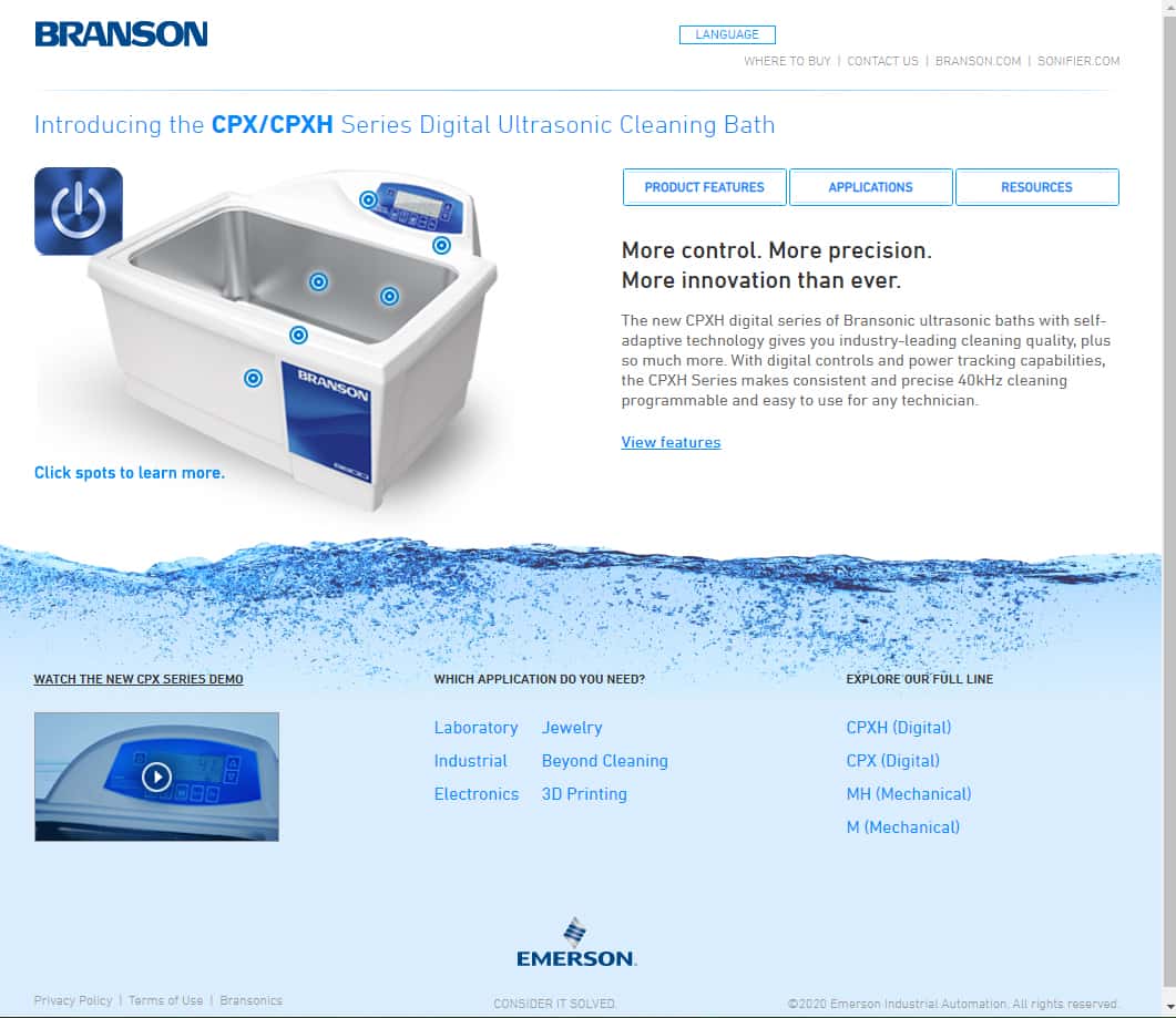 Emerson 的實驗室設備主要Bransonic 系列數位超音波震盪器。這些產品廣泛應用於樣品製備、清洗等實驗室應用。