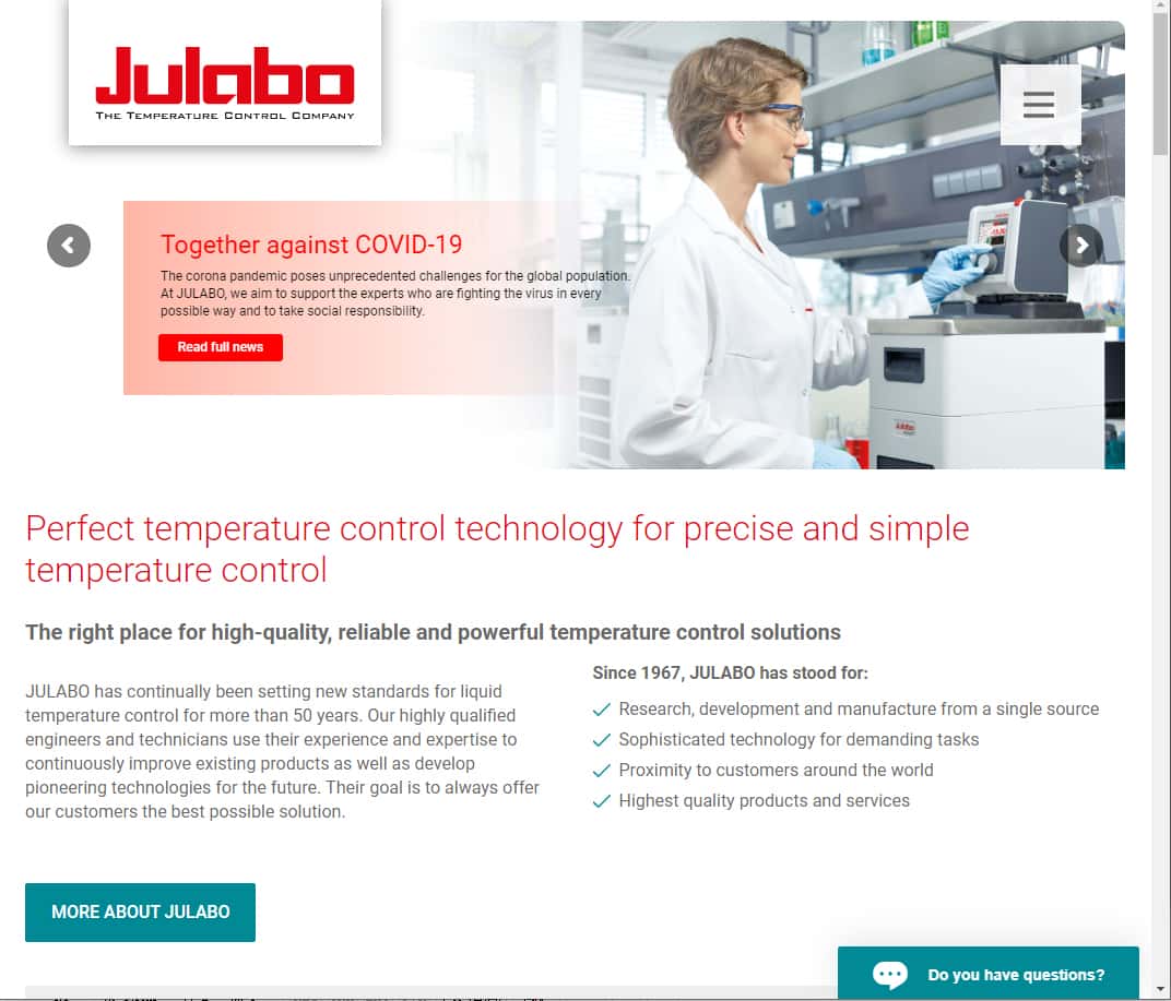 - 核心理念:JULABO 堅持「德國製造」的最高品質標準,所有產品的研發、生產和品質控制都在同一處完成。公司擁有超過450名員工,並以「專業服務」作為企業文化的核心,為全球客戶提供最優質的解決方案。