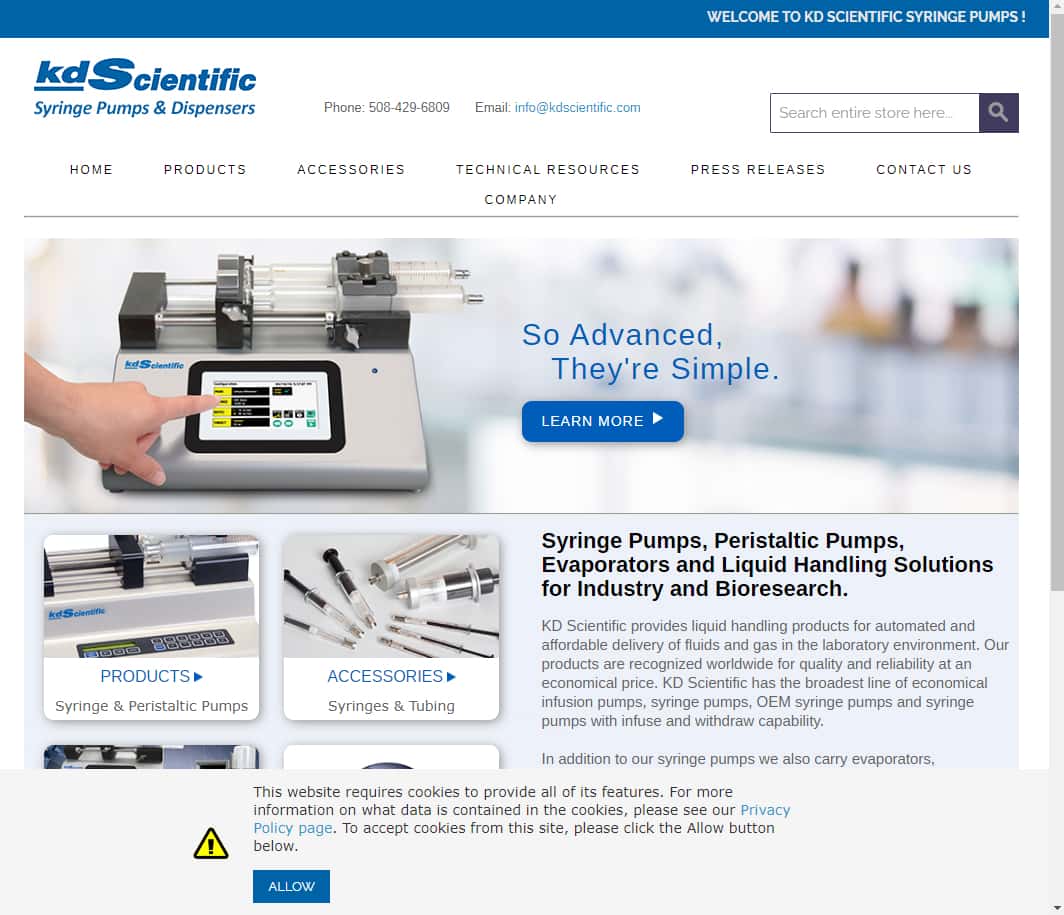KD Scientific是全球領先的注射幫浦(Syringe Pump)製造商,總部位於美國馬薩諸塞州霍利斯頓市。公司專注於開發、製造和銷售用於精確液體傳輸和分配的儀器。憑藉超過40年的經驗,KD Scientific已成為科學研究、醫療設備和工業應用領域值得信賴的品牌。